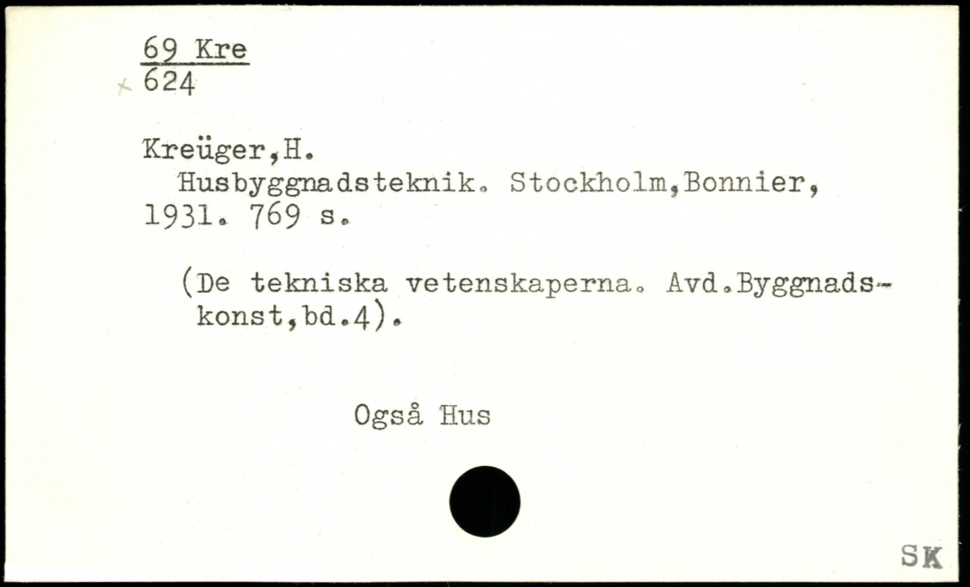 Husbyggmdstekniko Stockholm,Bonnier, 1931. 769 s. (De tekniska vetenskaperna., Avd.Byggnadskons t, bd. 4) , Også Hus