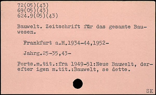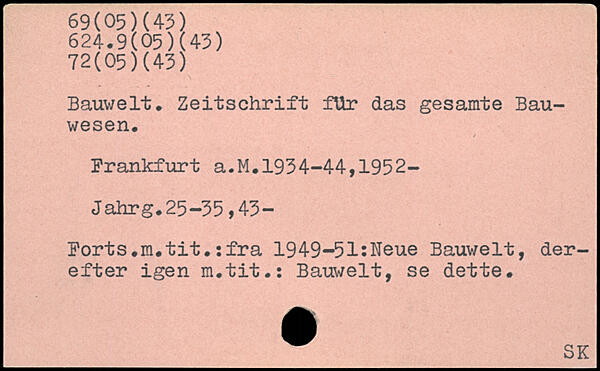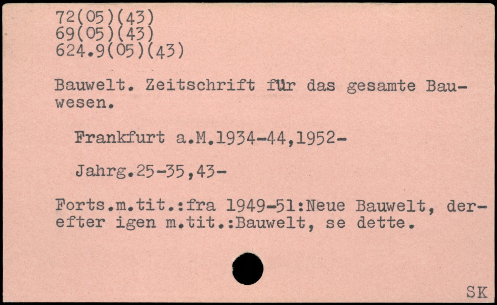 Bauwelt. Zeitschrift für das gesamte Bauwesen. Frankfurt a.M.1934-44,1952-Jahrg.25-35,43- Forts.m.tit.:fra 1949-51:Neue Bauwelt, derefter igen m. tit.:Bauwelt, se dette.