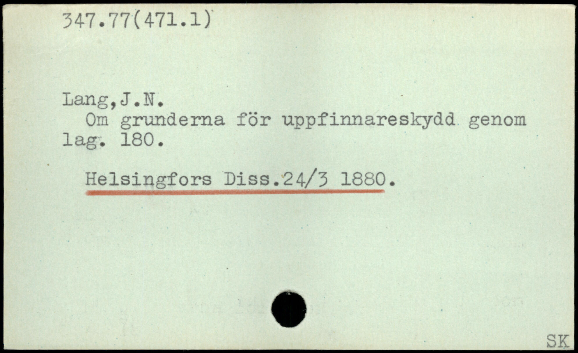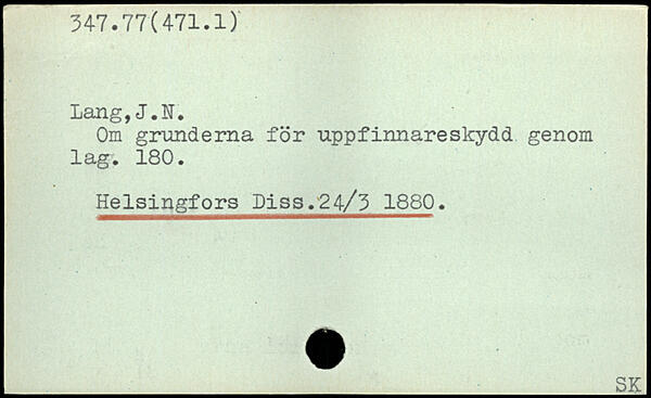 Om grunderna för uppfinnareskydd genom lag. 180. Helsingfors Diss.24/3 1880. ;
