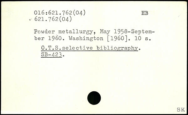 Powder metallurgy, May 1958-Septem-ber 1960.