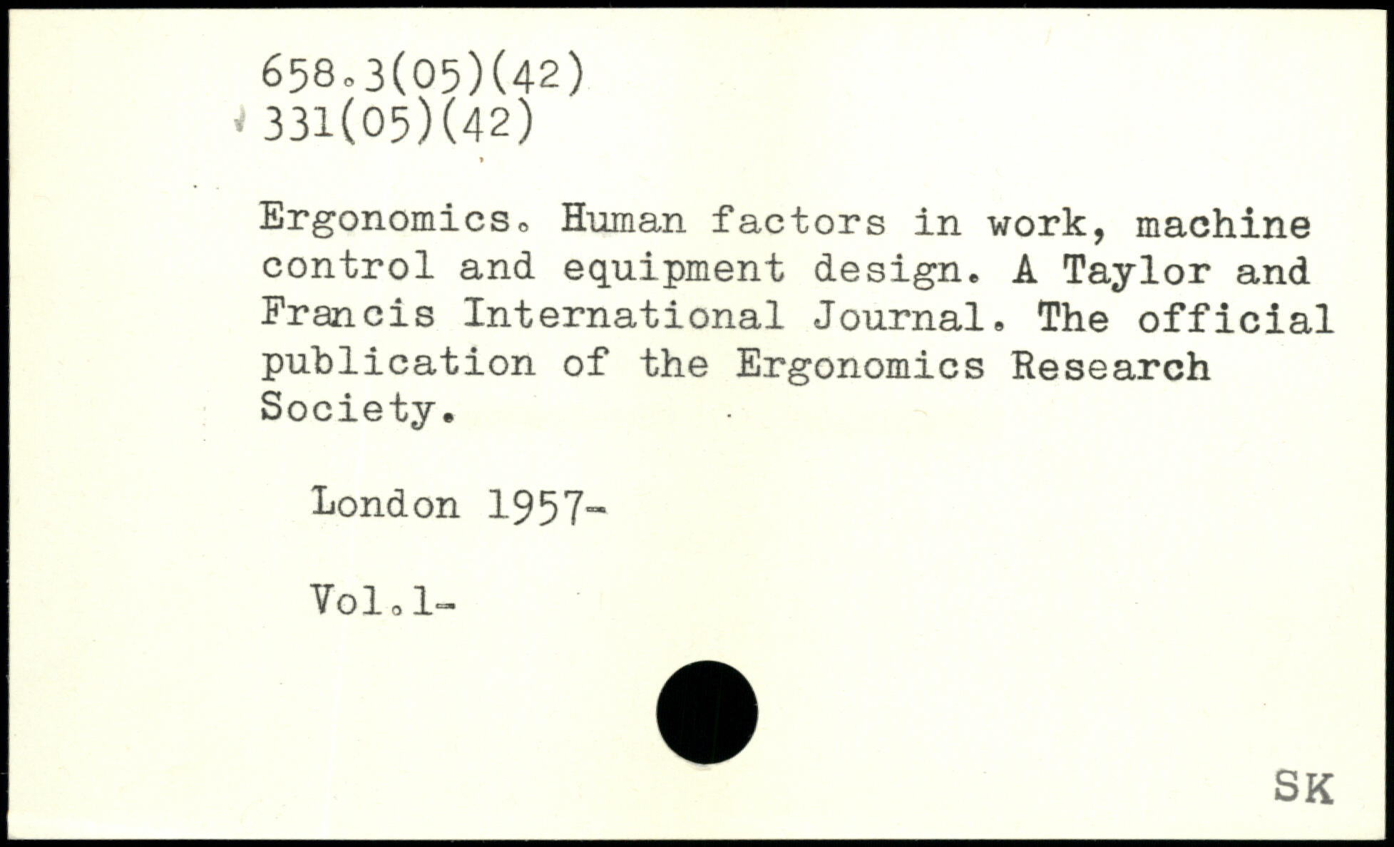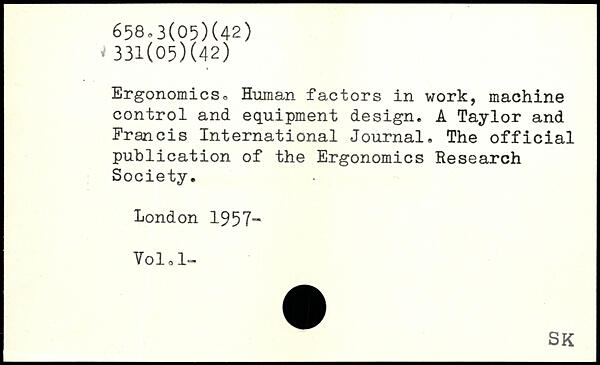 Ergonomics. Human factors in work, machine control and equipment design. A Taylor and Francis International Journal. The official publication of the Ergonomics Research Society.