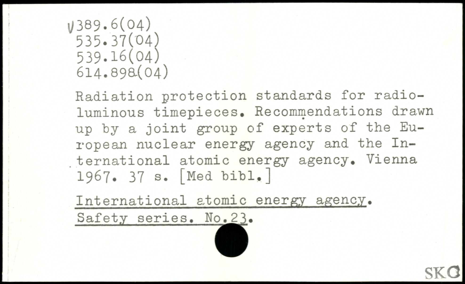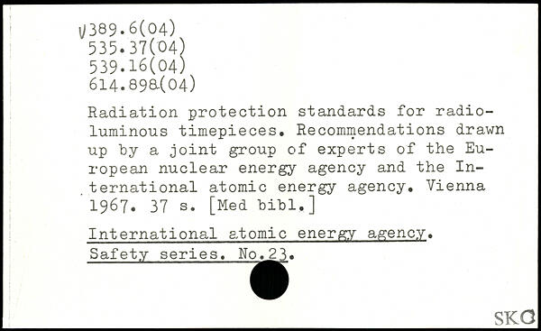 Radiation protection standards for radio-luminous timepieces. Recommendations drawn up by a joint group of experts of the European nuclear energy agency and the International atomic energy agency. Vienna ' 1967.