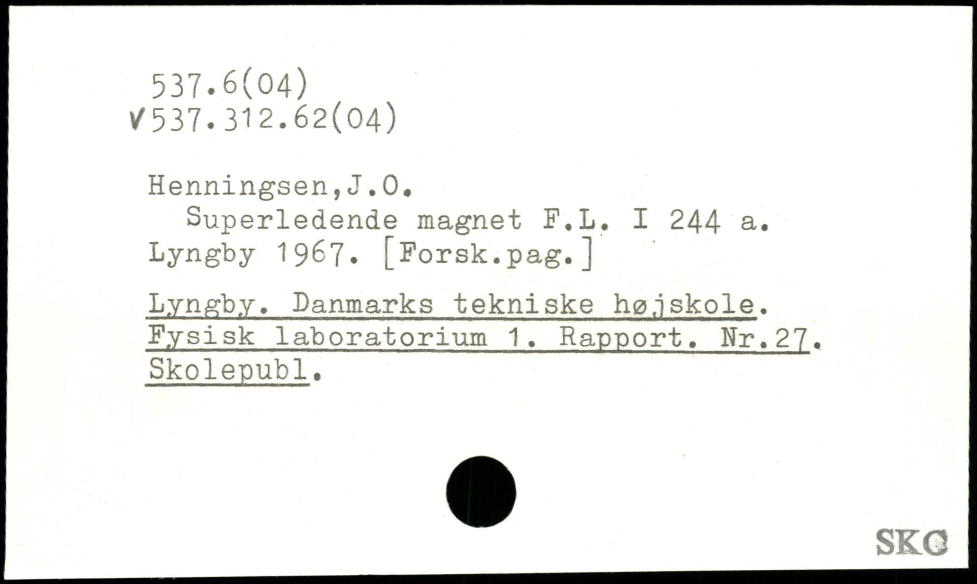 Superledende magnet F.L. I 244 a. Lyngby 19^7, [Forsk.pag.] Lyngby. Danmarks tekniske hø,i skole. Fysisk laboratorium 1, Rapport. Nr.27. Skolepubl.