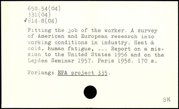 Fitting the job of the worker,, A survey of American and European research into 'working conditions in industry, Heat & cold, human fatigue, 500 Report on a mission to the United States 1956 and on the Leyden Seminar 1957.