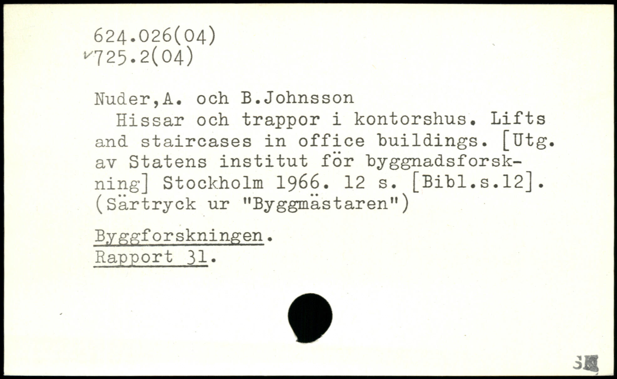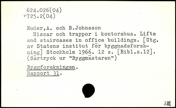 Hissar och trappor i kontorshus. Lifts and staircases in office buildings, [Utg. av Statens institut för byggnadsforsk-ning]