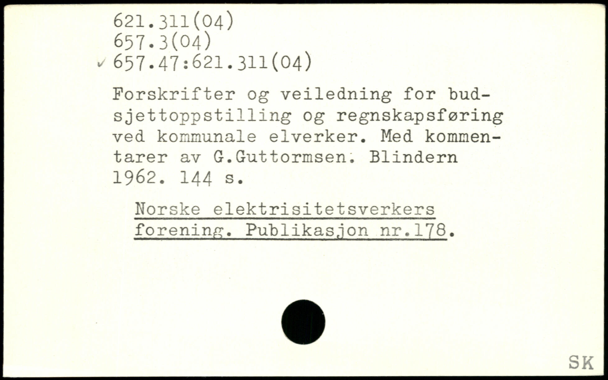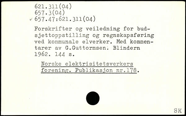 Forskrlfter 0g veiledning for bud-sjettoppst1111ng 0g regnskapsforing ved kommunale elverker. Med kommen-tarer av G. Guttormsen. Blindem 1962.