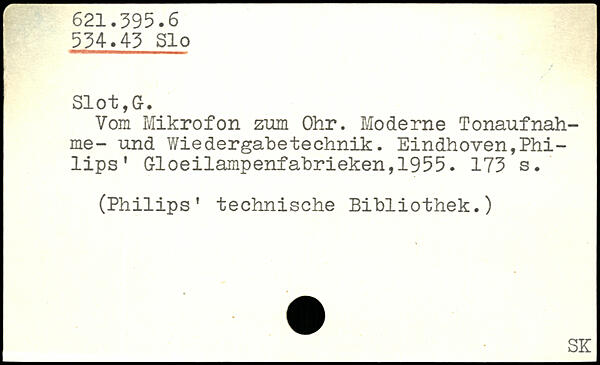 Slot , Gr. Vom Mikrofon zum Ohr. Moderne Tonaufnahme- und Wiedergabetechnik. Eindhoven,Philips ' Gloeilampenfabrieken,1955.