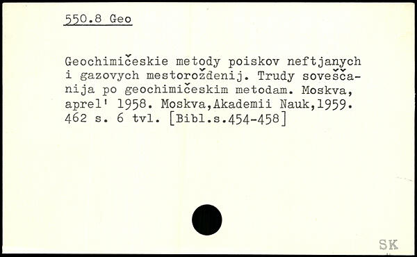 Geochimiceskie metody poiskov neftjanych i gazovych mestorozdenij. Trudy sovesca-nija po geochimiceskim metodam. Moskva, aprel. 1958