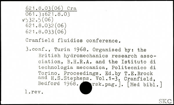 Cranfield fluidics conference. 3.conf., Turin 1968. Organised by: the British hydromechanics research association, B.H.R.A. and the Istituto di technologia meccanica, Politecnico di Torino. Proceedings. Ed.by T.E.Brock and H.S.Stephens.