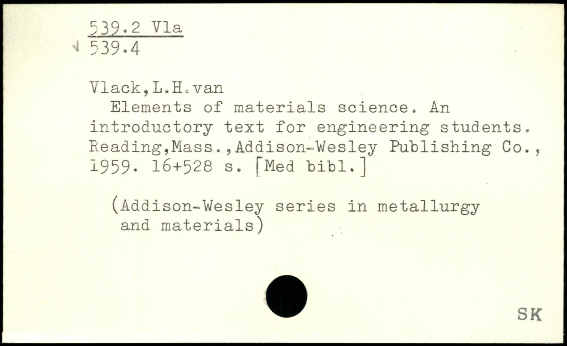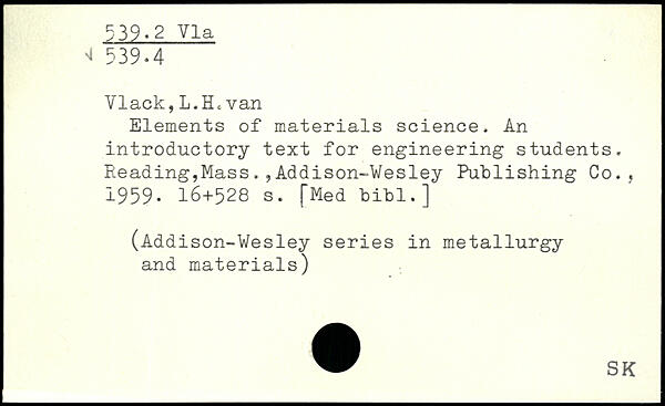 Elements of materials science, An introductory text for engineering students. Reading,Mass,,Addison-Wesley Publishing Co., 1959-