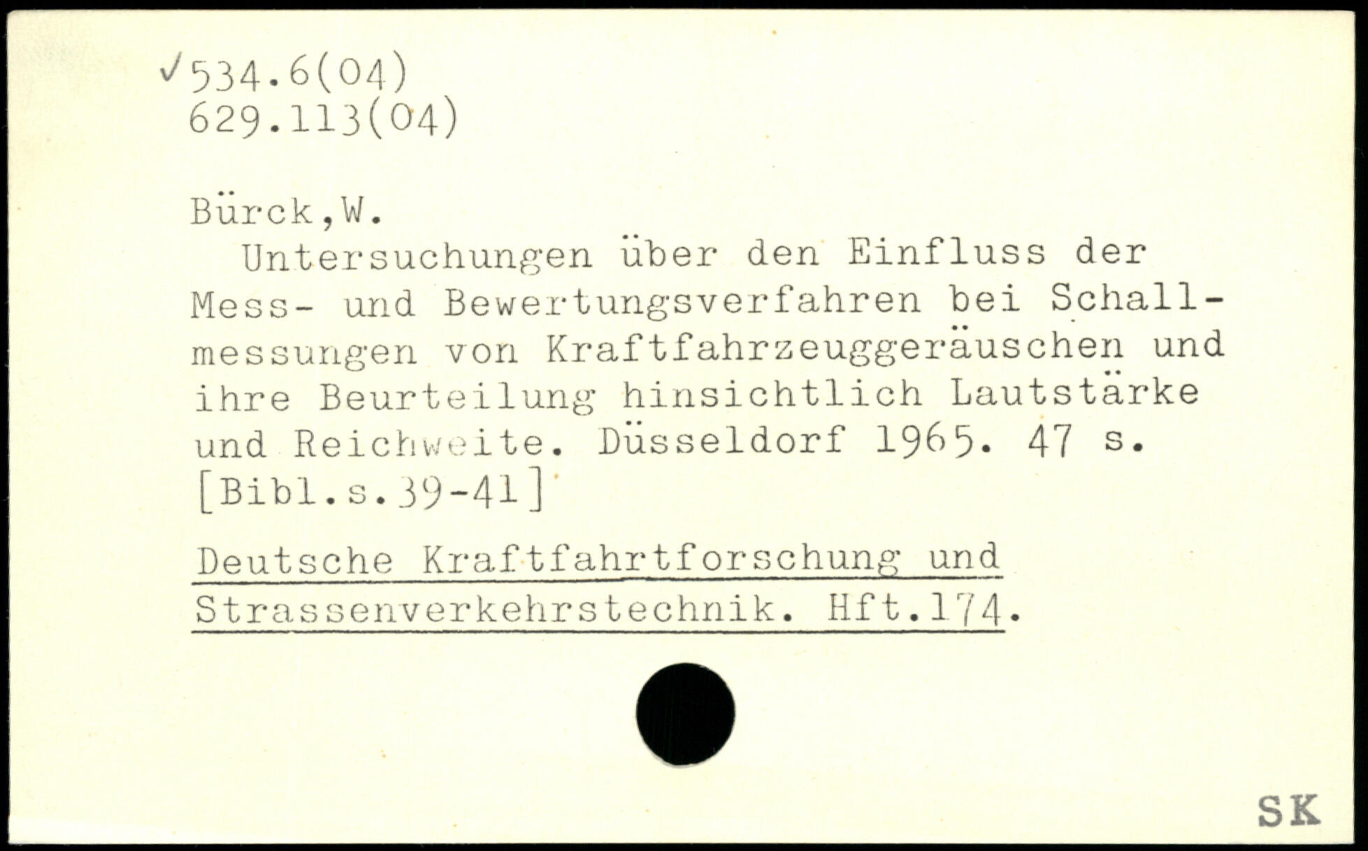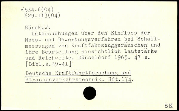 BÜrck,W. Untersuchungen über den Einfluss der Mess- und Bewertungsverfahren bei Schallmessungen von Kraftfahrzeuggeräuschen und ihre Beurteilung hinsichtlich Lautstarke und Reichweite. Düsseldorf 1965