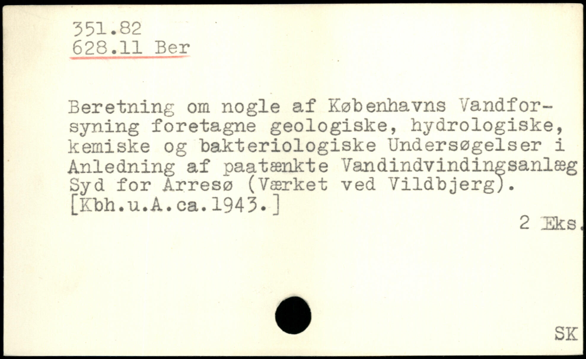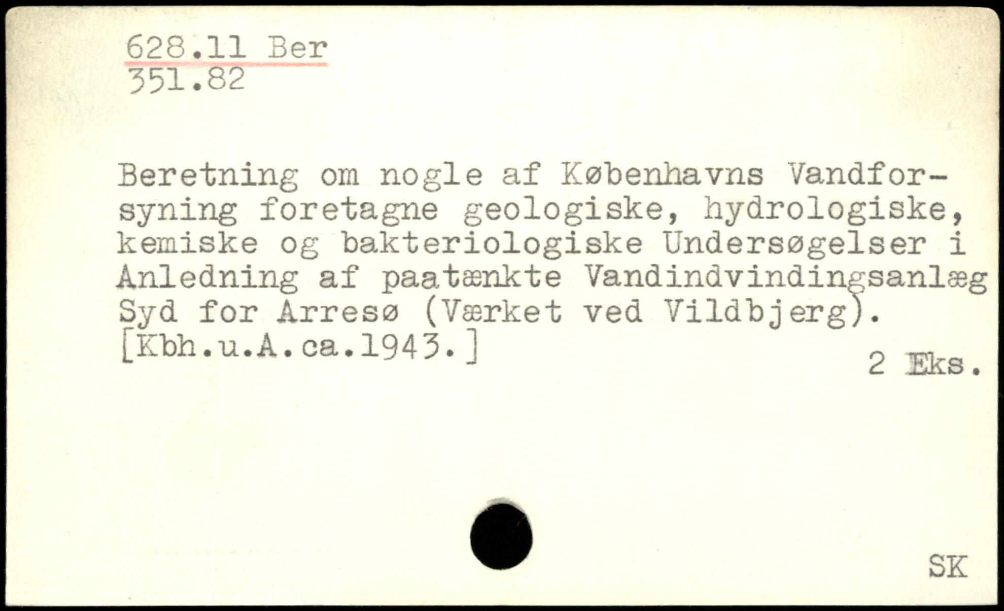 Beretning om nogle af Københavns Vandforsyning foretagne geologiske, hydrologiske, kemiske og bakteriologiske Undersøgelser i Anledning af paatænkte Vandindvindingsanlæg Syd for Arresø (Værket ved VildbjergT. [Kbh.u.A.ca.1945,1 2 Eks