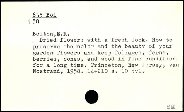 Dried flowers with a fresh look. How to preserve the color and the beauty of your garden flowers and keep foliages, ferns, berries, cones, and wood in fine condition for a long time. Princeton, New Jersey, van Nostrand, 1958.