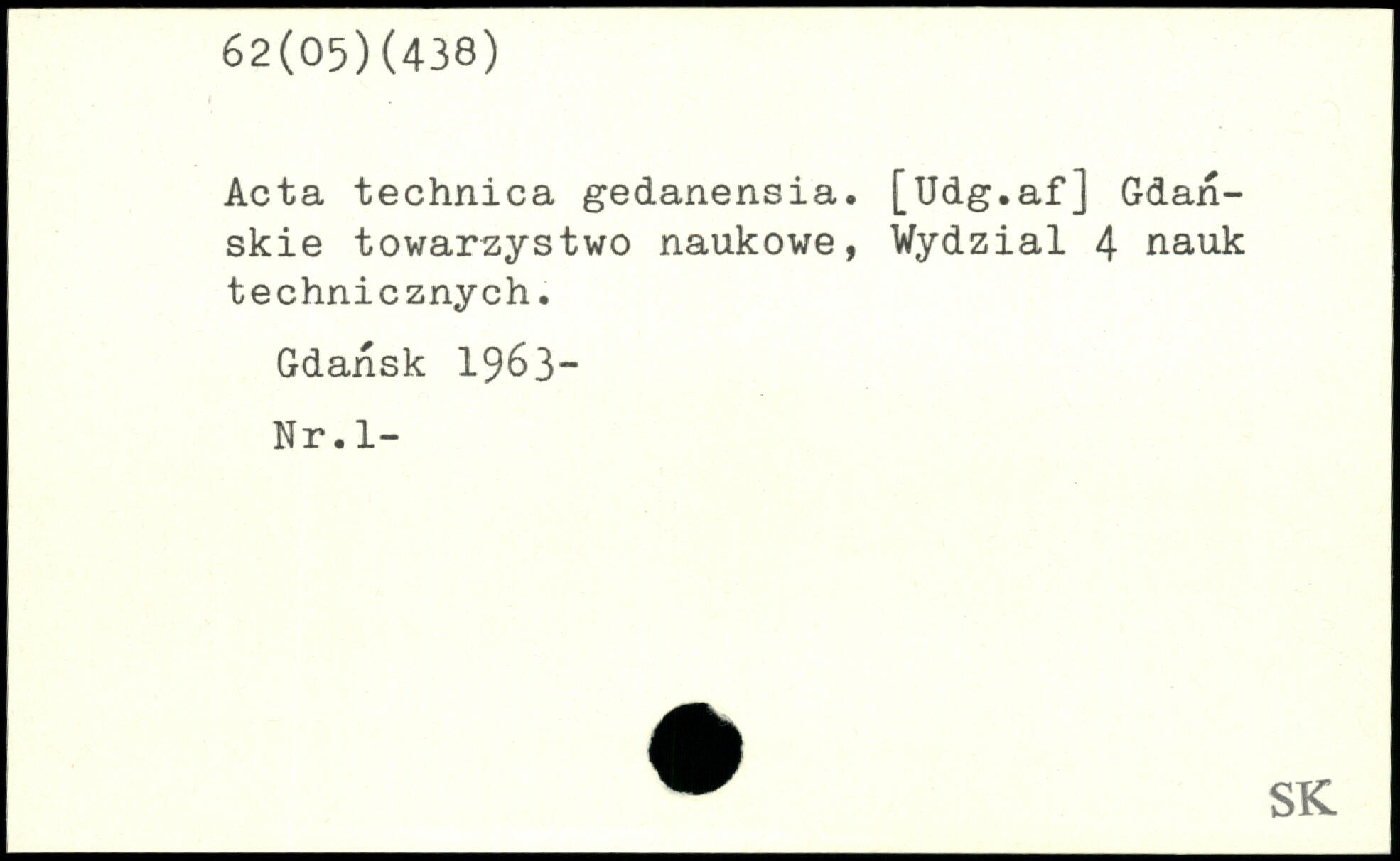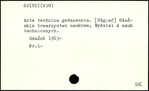 Acta technica gedanensia. [Udg. af] Gdan- j skie towarzystwo naukowe, Wydzial 4 nauk technicznych. Gdansk 1963“ Nr. 1-