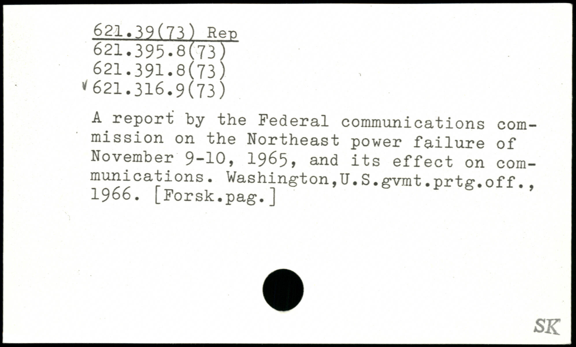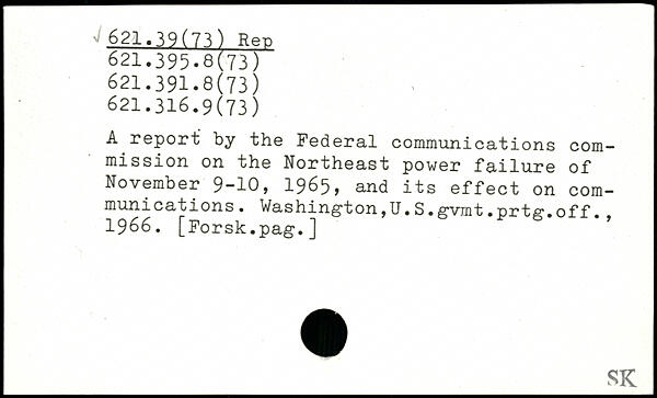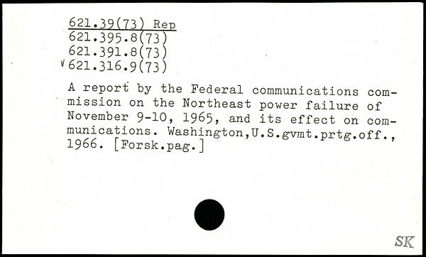 A report by the Federal communications com-mission on the Northeast power failure of November 9-10, 1965, and its effect on communications. Washington,U.S. gvmt.prtg.off., 1966. [Forsk.pag.]