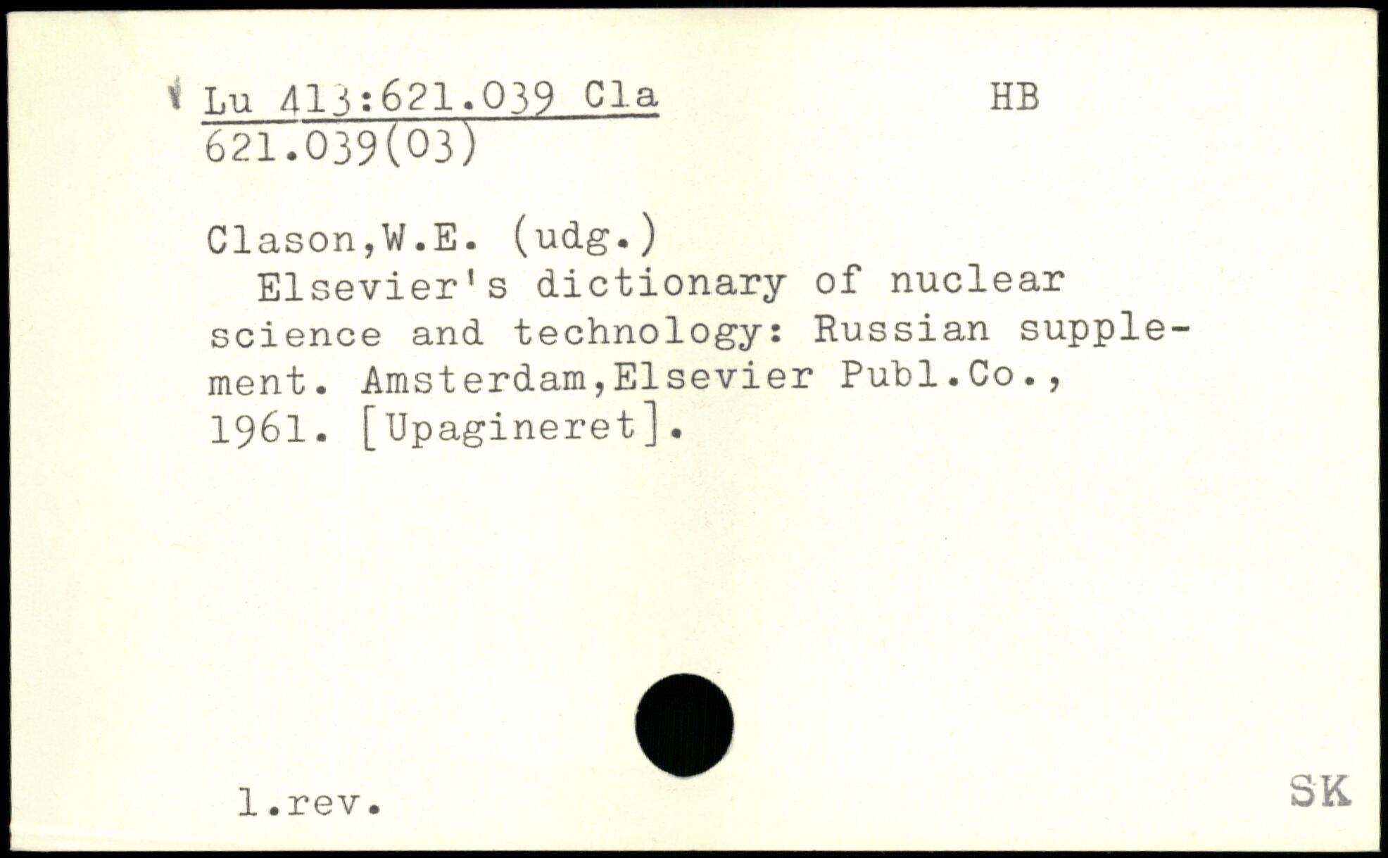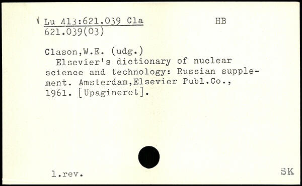 Elsevier's dictionary of nuclear science and technology: Russian supplement. Amsterdam,Elsevier Publ.Co., 1961. [Upagineret]. l.rev. SK-