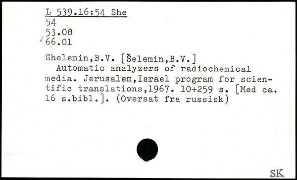 Shelemin,B.V. [Selemin,B.V.] Automatic analyzers of radiochemical media. Jerusalem,Israel program for scientific translations,1967.