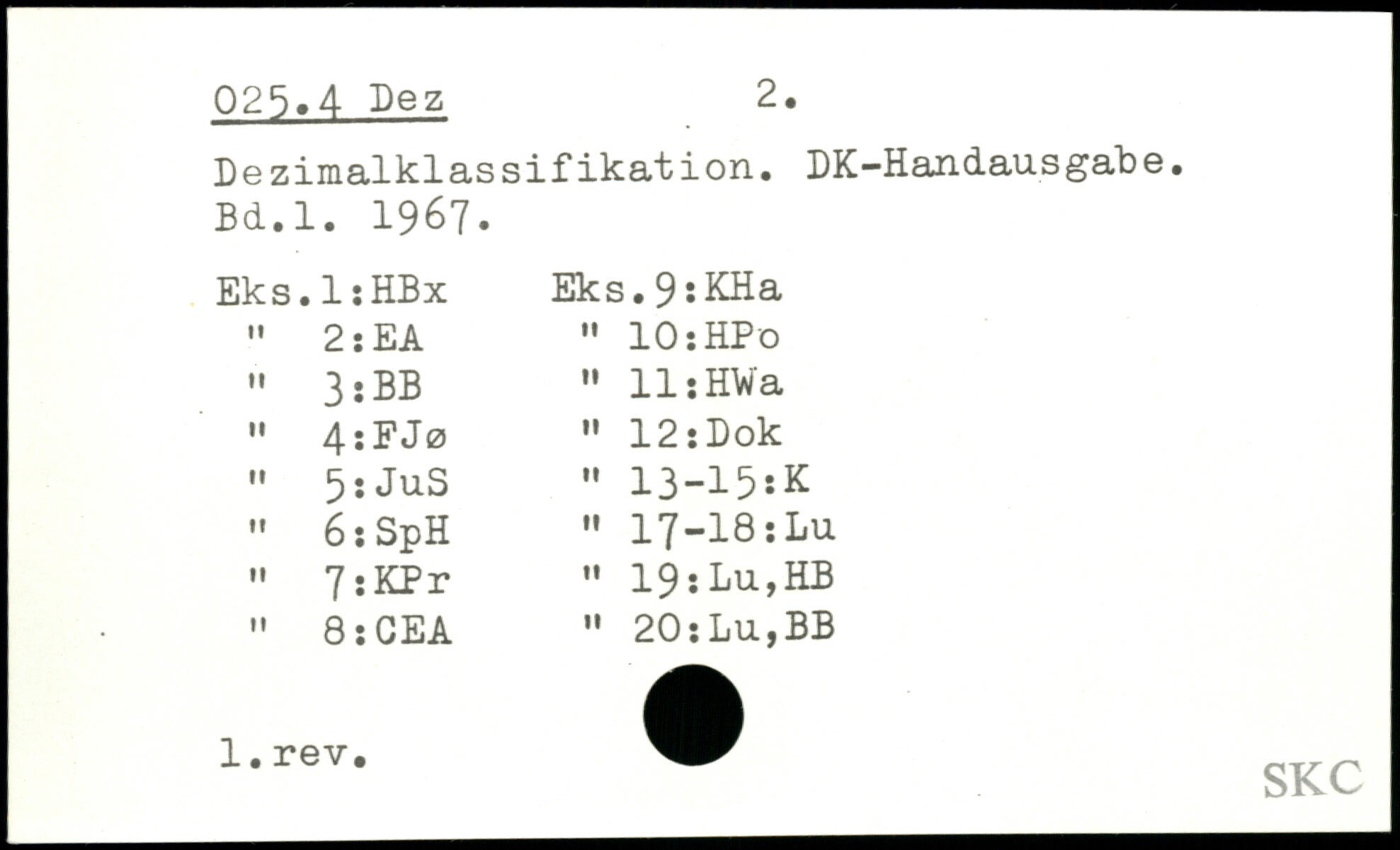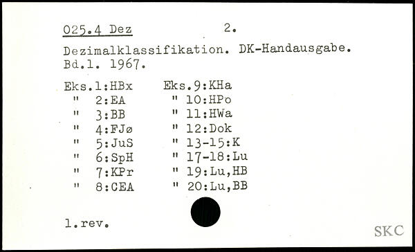 Dezimalklassifikation. DK-Handausgabe. Bd.l. 1967. Eks.lïHBx Eks.9îKHa , 2 ï EA " IOîHPo , 3:BB " 11 i HWa '. 4:FJø " 12: Dok " 5:JuS " 13-15sK " 6 :SpH " 17-18:Lu " 7 :KPr " 19 :Lu,HB " 8 : CEA ” 20:Lu,BB