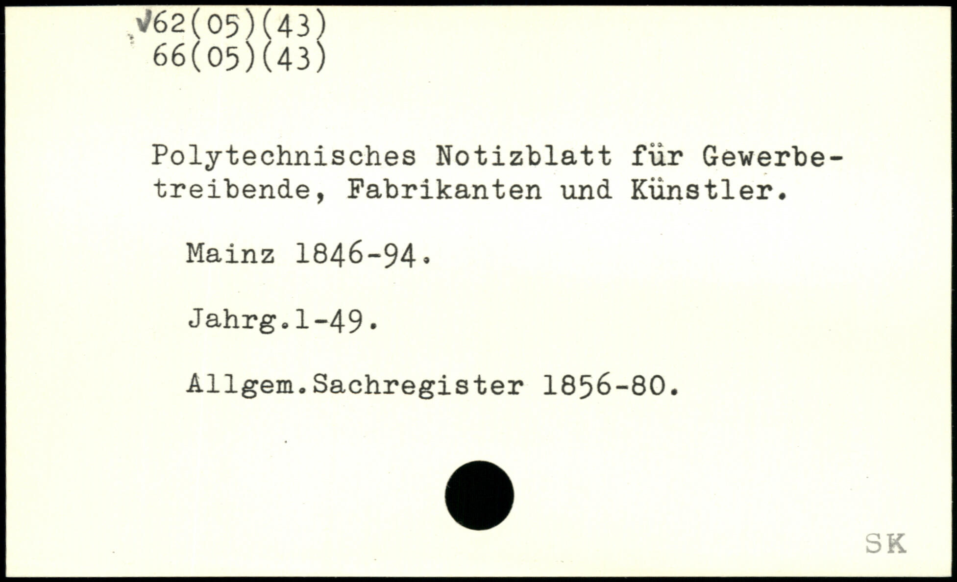 Polytechnisches Notizblatt für Gewerbetreibende, Fabrikanten und Künstler. Mainz 1846-94. Jahrg.1-49. Allgem.Sachregister 1856-80.