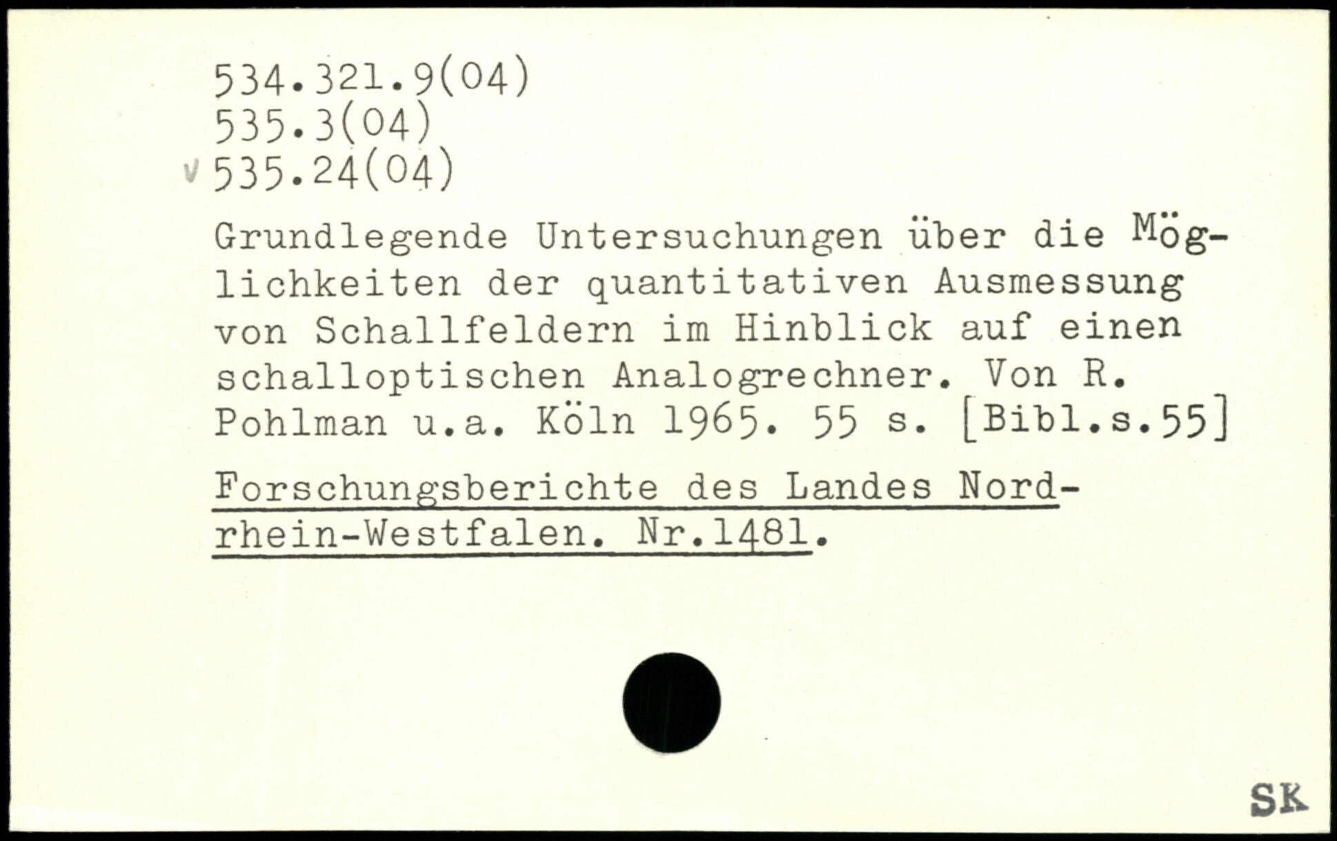 Grundlegende Untersuchungen über die Mog-lichkeiten der quantitativen Ausmessung von Schallfeldern im Hinblick auf einen schalloptischen Analogrechner. Von R. Pohlman u.a. Köln 19&5.