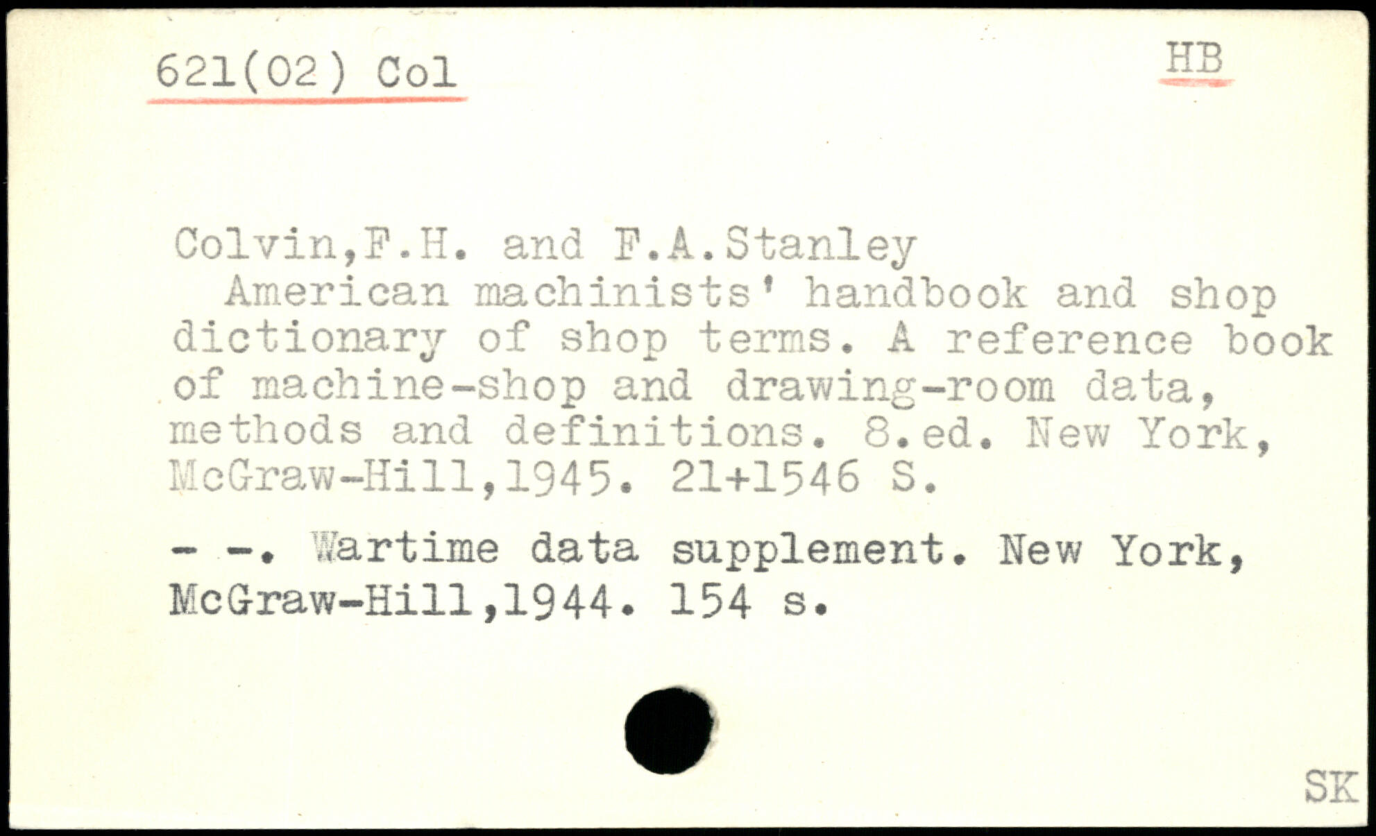 Colvin,F.H. and F. A.Stanley American machinists’ handbook and shop dictionary of shop terms. A reference book of machine-shop and drawing-room data, methods and definitions.