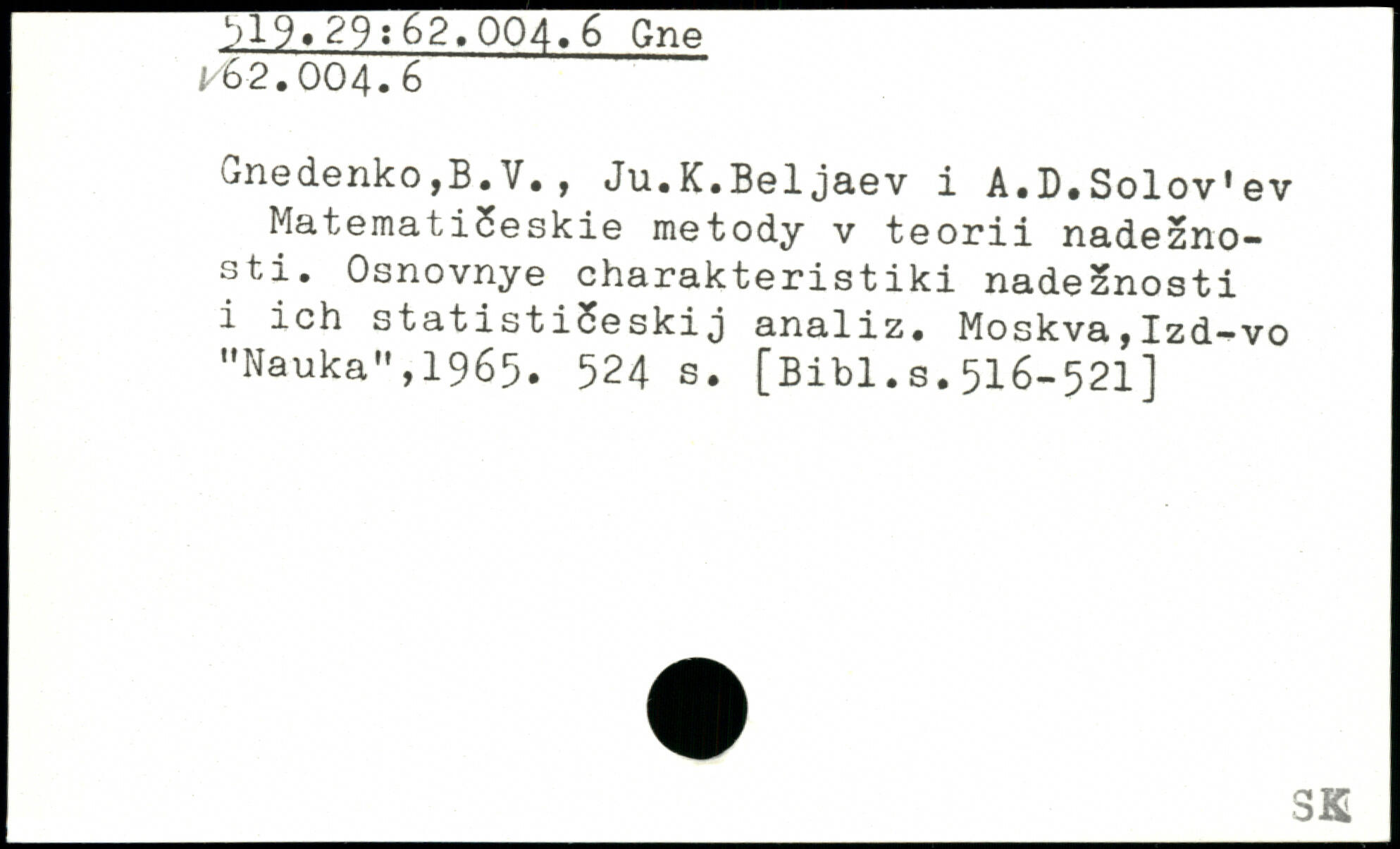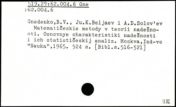 unedenko,B.V., Ju.K.Beljaev i A,D#Solov.ev MatematiSeskie metody v teorii nadezno-sti. Osnovnye Charakteristik! nade^nosti i ich statistiSeskij analiz. Moskva,Izd^vo "Nauka",1965.
