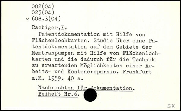 Patentdokumentation mit Hilfe von Flächenlochkarten. Studie über eine Pa-tentdokumentation auf dem Gebiete der Membranpumpen mit Hilfe von Flächenlochkarten und die dadurch für die Technik zu erwartenden Möglichkeiten einer Ar-beits- und Kostenersparnis. Frankfurt a.M. 1959