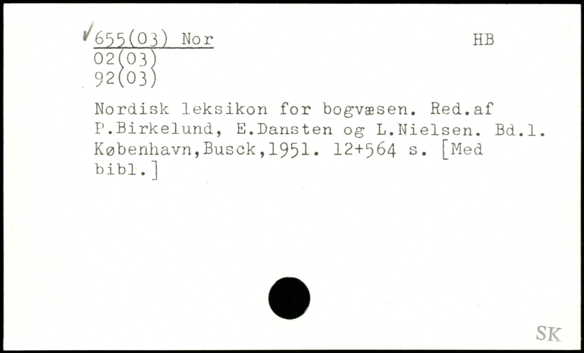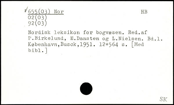 Nordisk leksikon for bogvæsen. Red.af P.Birkelund, E.Dansten og L.Nielsen. Bd.l.