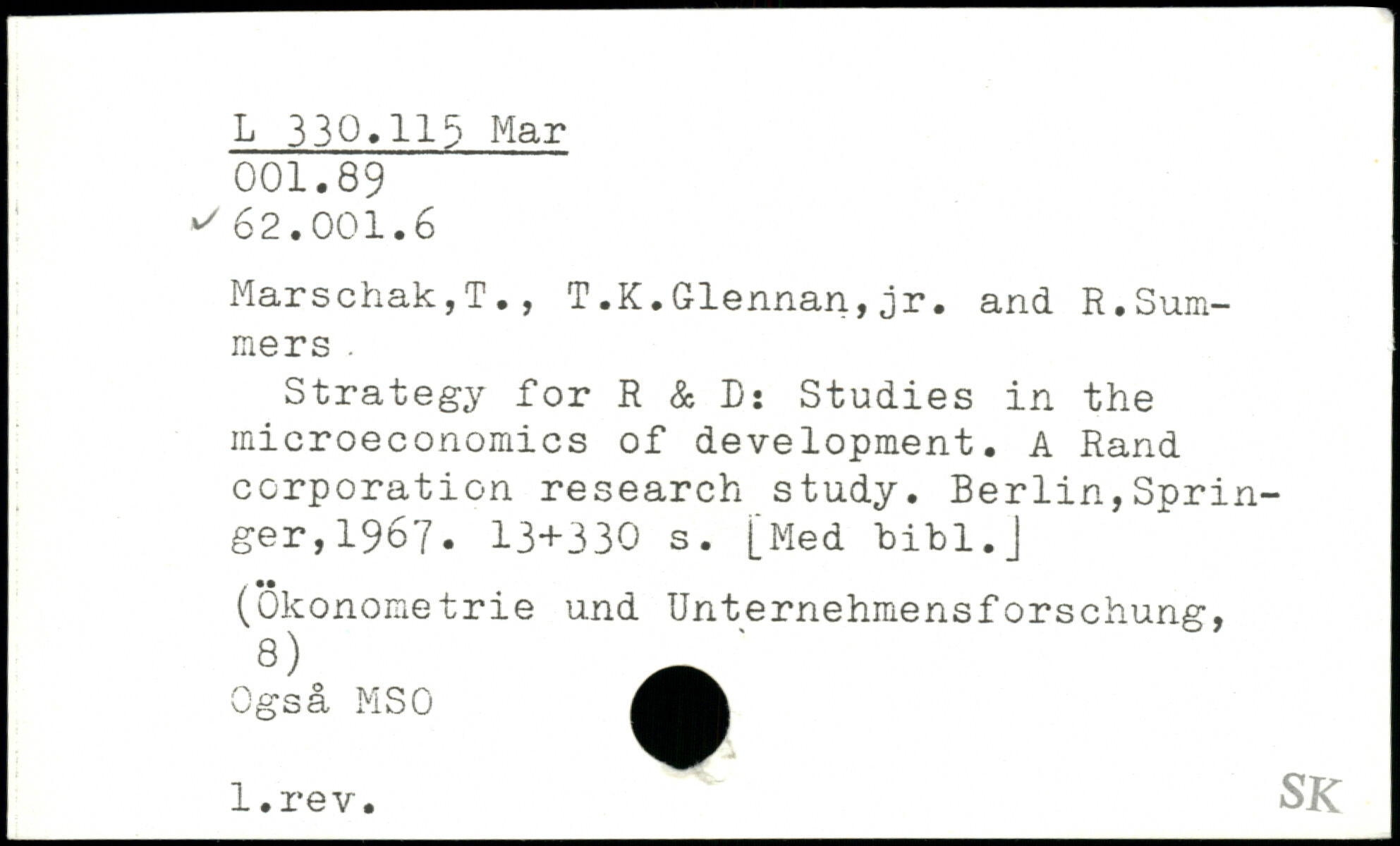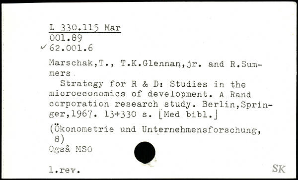 Marschak, T. , T.K.Glennan,jr. and R.Summers. Strategy for R & D: Studies in the microeconomics of development. A Rand corporation research study.