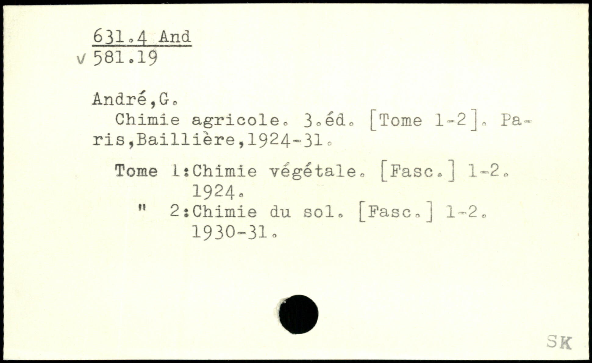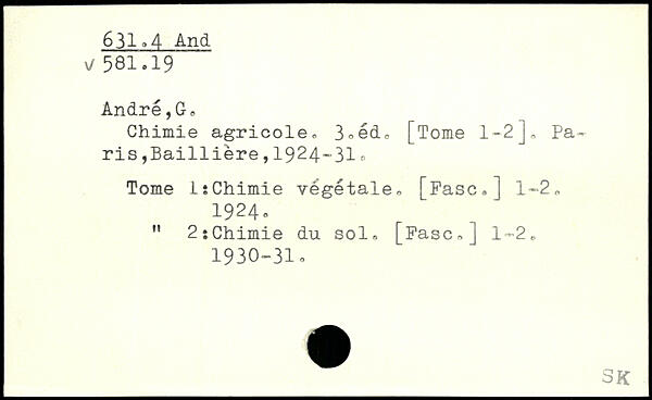 Chimie agricole. 3.èd. [Tome 1-2J. Paris , Ba1111ère , 1924-31 Tome 1:Chimie végétale. [Fasc.J 1-2. 1924. " 2 : Chimie du sol. [Fasc.] 1-2. 1930-31.
