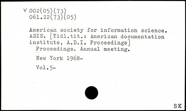 American society for information science. ASIS. [Tidl.tit.: American documentation institute, A.D.I. Proceedings] Proceedings. Annual meeting.