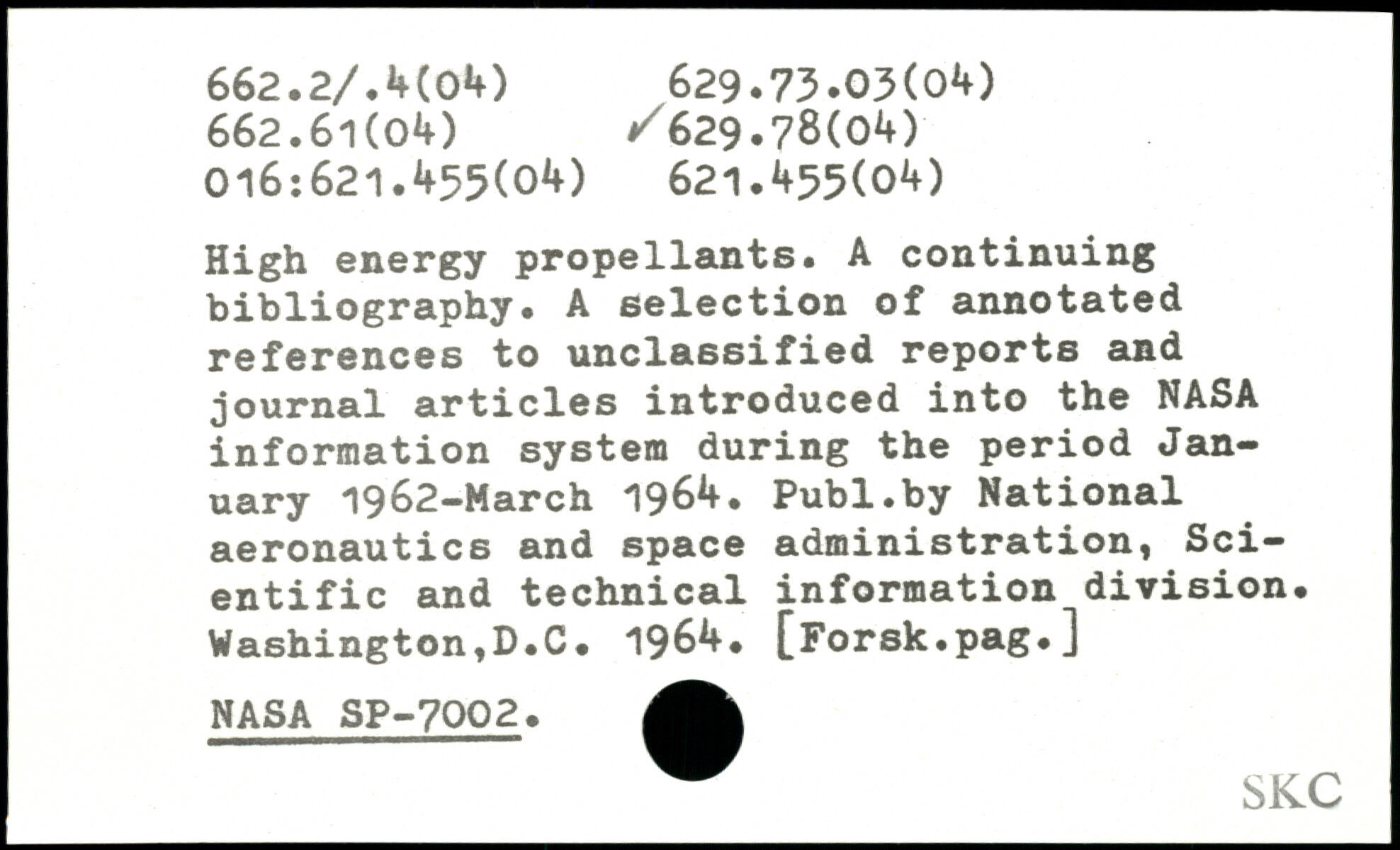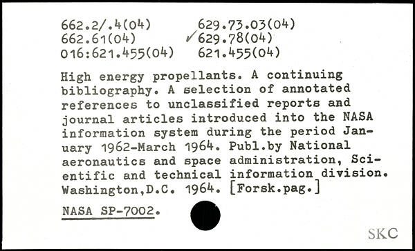 High energy propellants. A continuing bibliography. A selection of annotated references to unclassified reports and journal articles introduced into the NASA information system during the period January 1962-March 196M