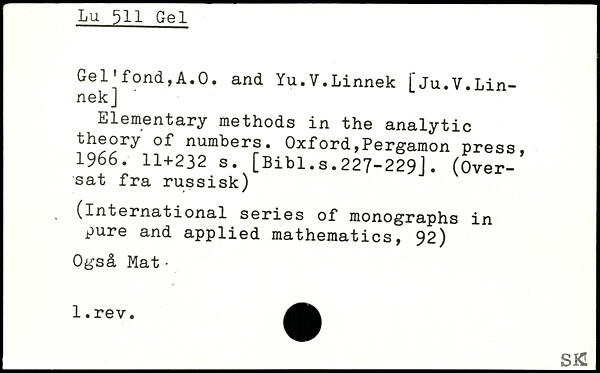 Gel’fond,A.0. and Yu.V.Linnek [ju.V.Lin- nekj Elementary methods in the analytic theory of numbers.