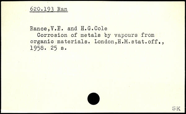 Corrosion of metals by vapours from organic materials. London,H.M.stat.off., 1958.