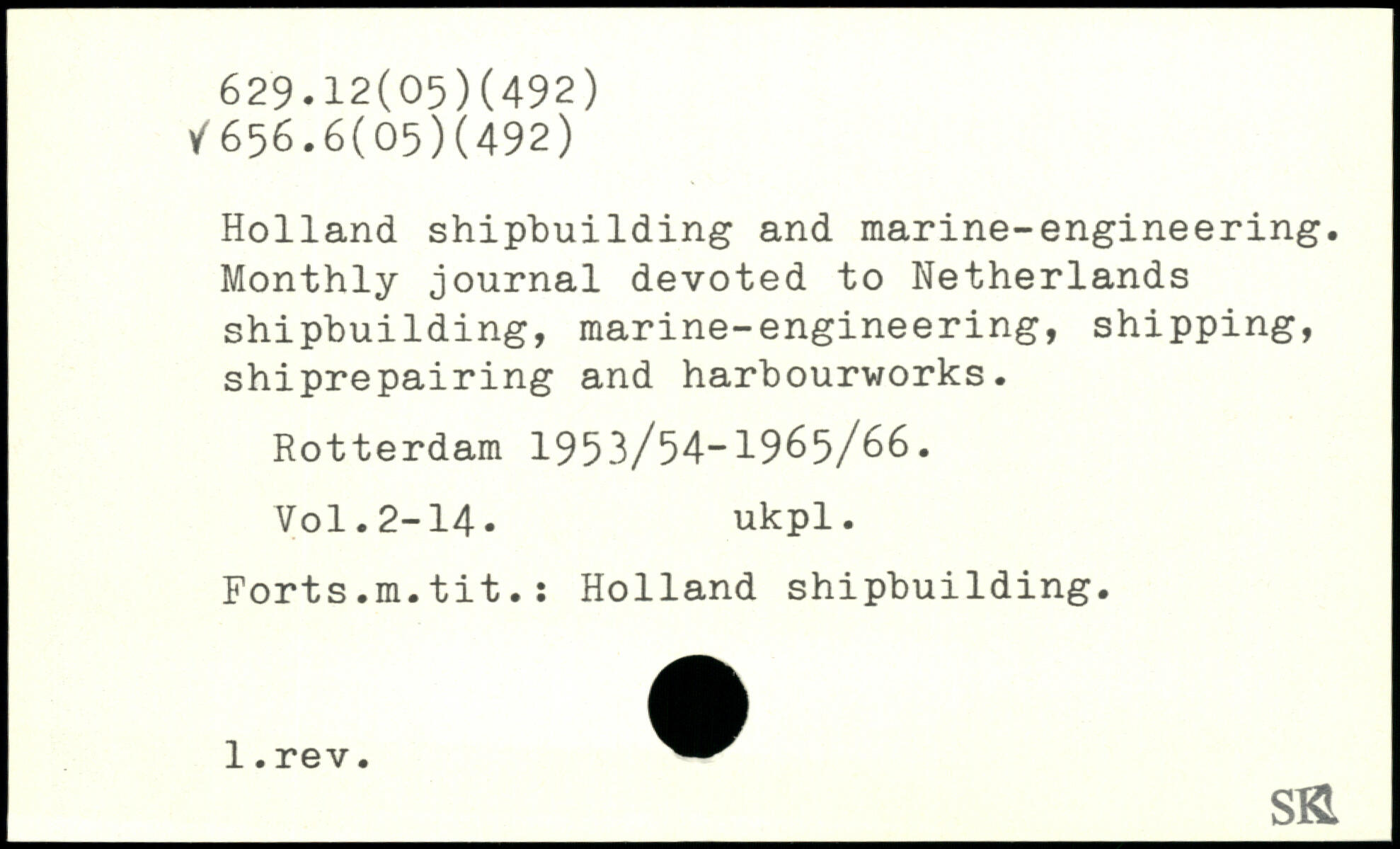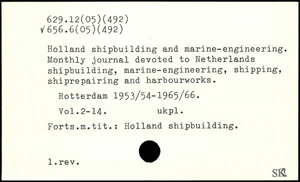 Holland shipbuilding and marine-engineering. Monthly journal devoted to Netherlands shipbuilding, marine-engineering, shipping, shiprepairing and harbourworks. Rotterdam 1953/54-1965/66.