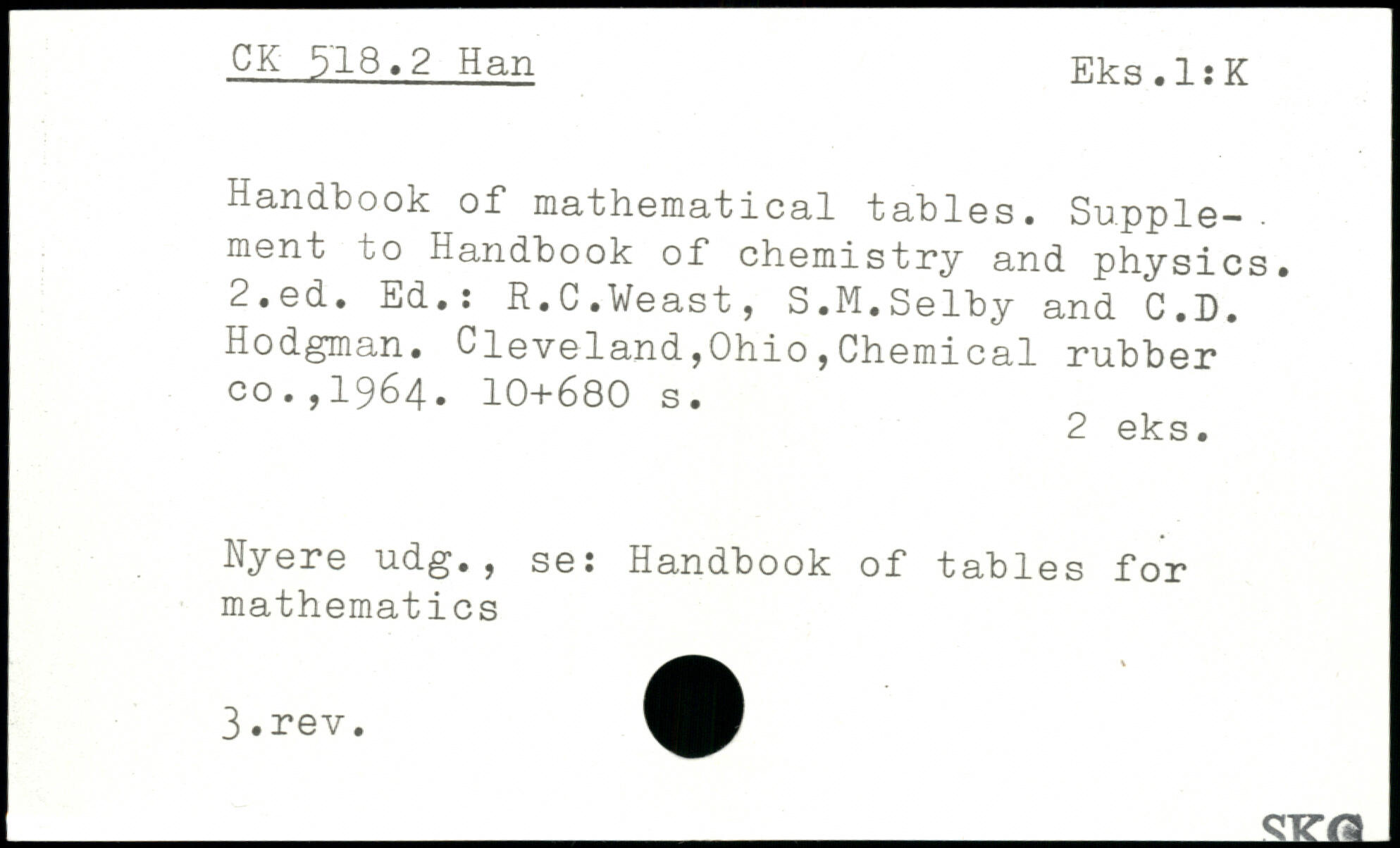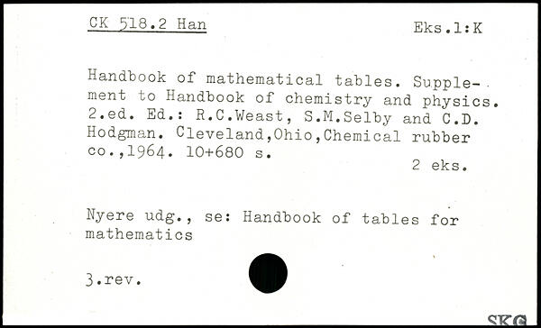 Handbook of mathematical tables. Supple-, ment to Handbook of chemistry and physics.