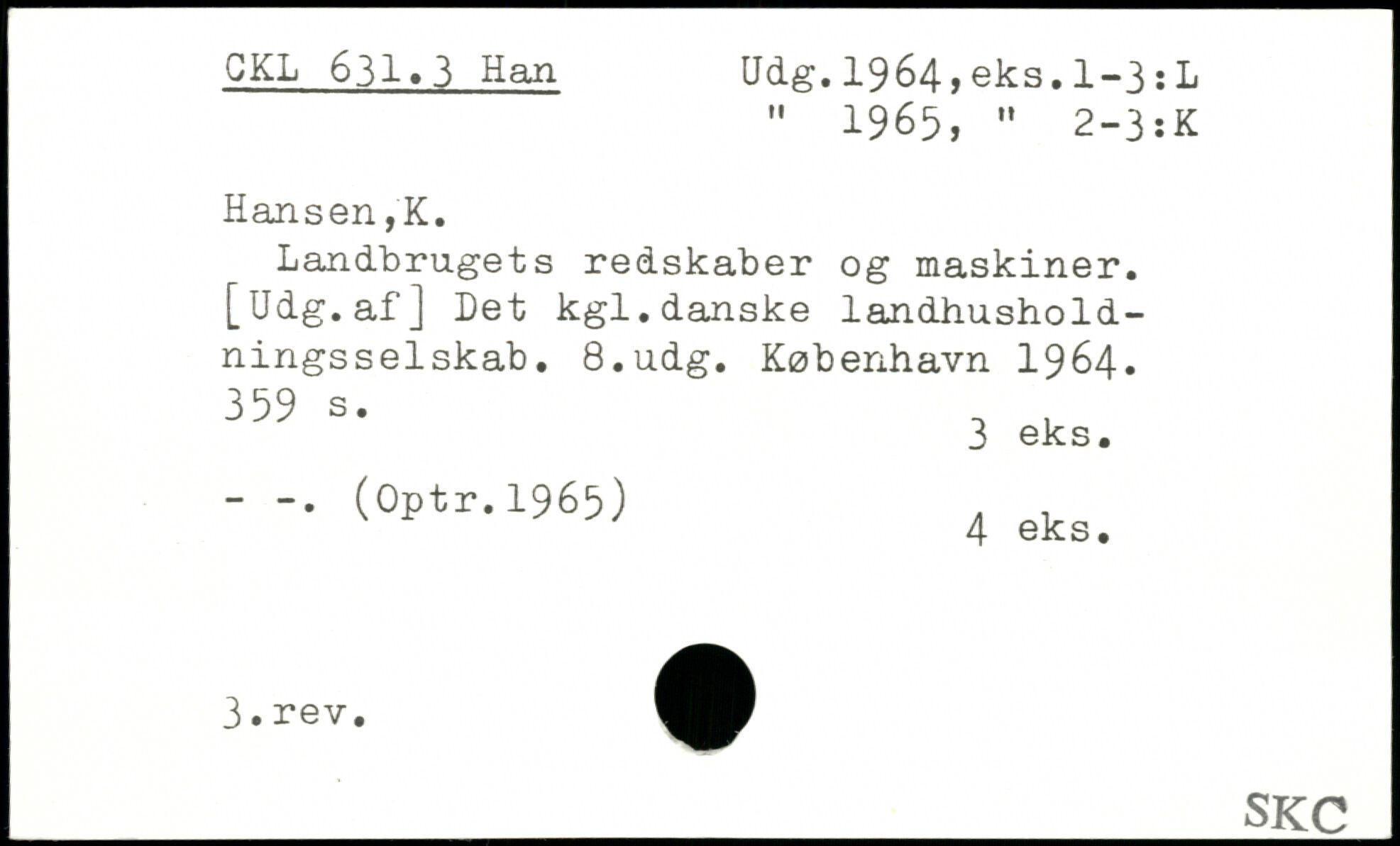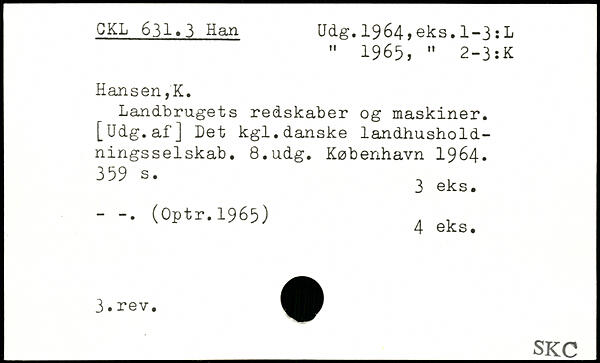 " 1965, “ 2-3:K Hansen,K. Landbrugets redskaber og maskiner. [Udg.af] Det kgl.danske landhusholdningsselskab.