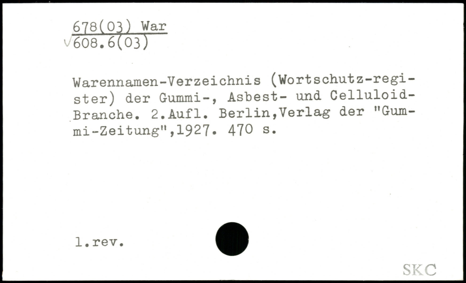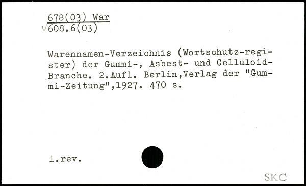 Warennamen-Verzeichnis (Wo rtschütz-regi-ster) der Gummi-, Asbest- und Celluloid-Branche.
