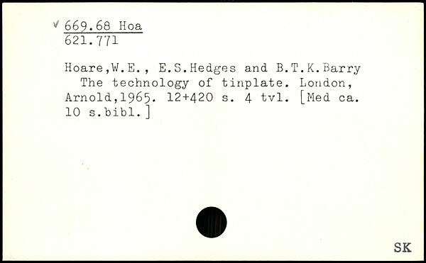 Hoare,W.E., E.S.Hedges and B.T.K.Barry The technology of tinplate.