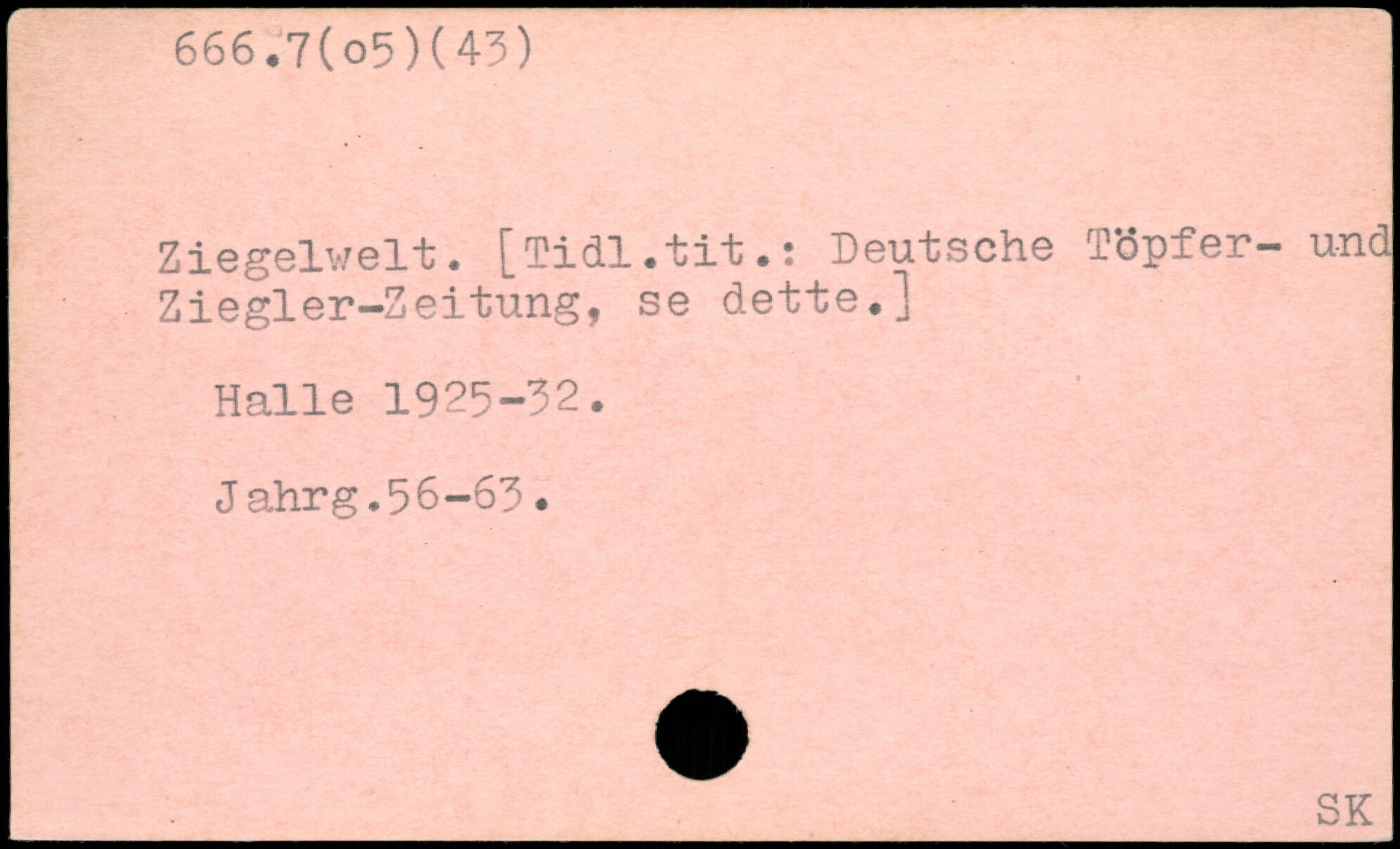 Ziegelwelt. [Tidl.tit.: Deutsche Töpfer- und Ziegler-Zeitung, se dette.] Halle 1925-32. Jahrg.56-63.