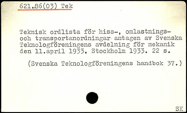 Teknisk ordlista för hiss-, omlastnings-och transportanordningar antagen av Svenska Teknologföreningens avdelning för mekanik den 11.april 1933.