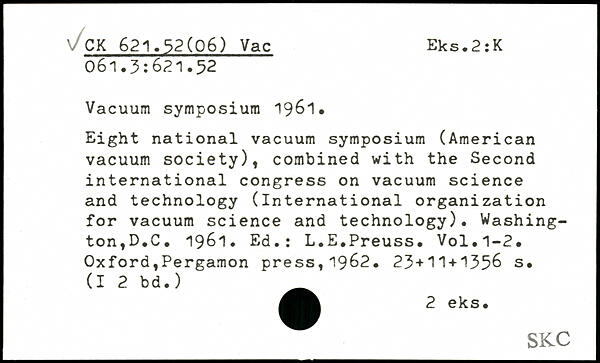 Vacuum symposium 1961. Eight national vacuum symposium (American vacuum society), combined with the Second international congress on vacuum science and technology (international organization for vacuum science and technology). Washington,D.C. 1961. Ed.: L.E.Preuss.