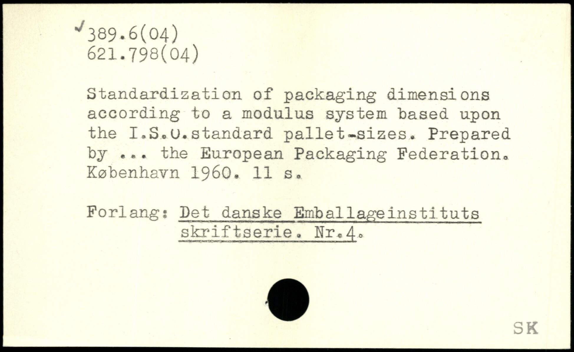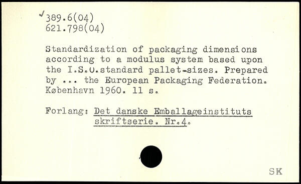 Standardization of packaging dimensions according to a modulus system based upon the I.S.U.standard pallet-sizes. Prepared by ... the European Packaging Federation.