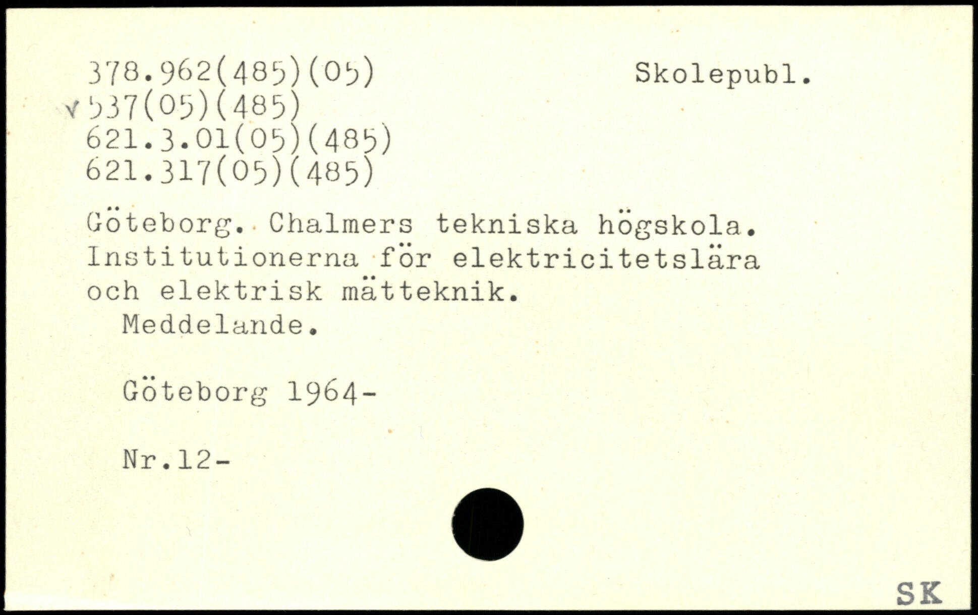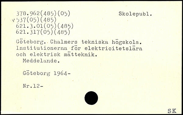 Göteborg. Chalmers tekniska högskola. Institutionerna för elektricitet slära och elektrisk mätteknik. Meddelande. Göteborg 1964- Nr.12-