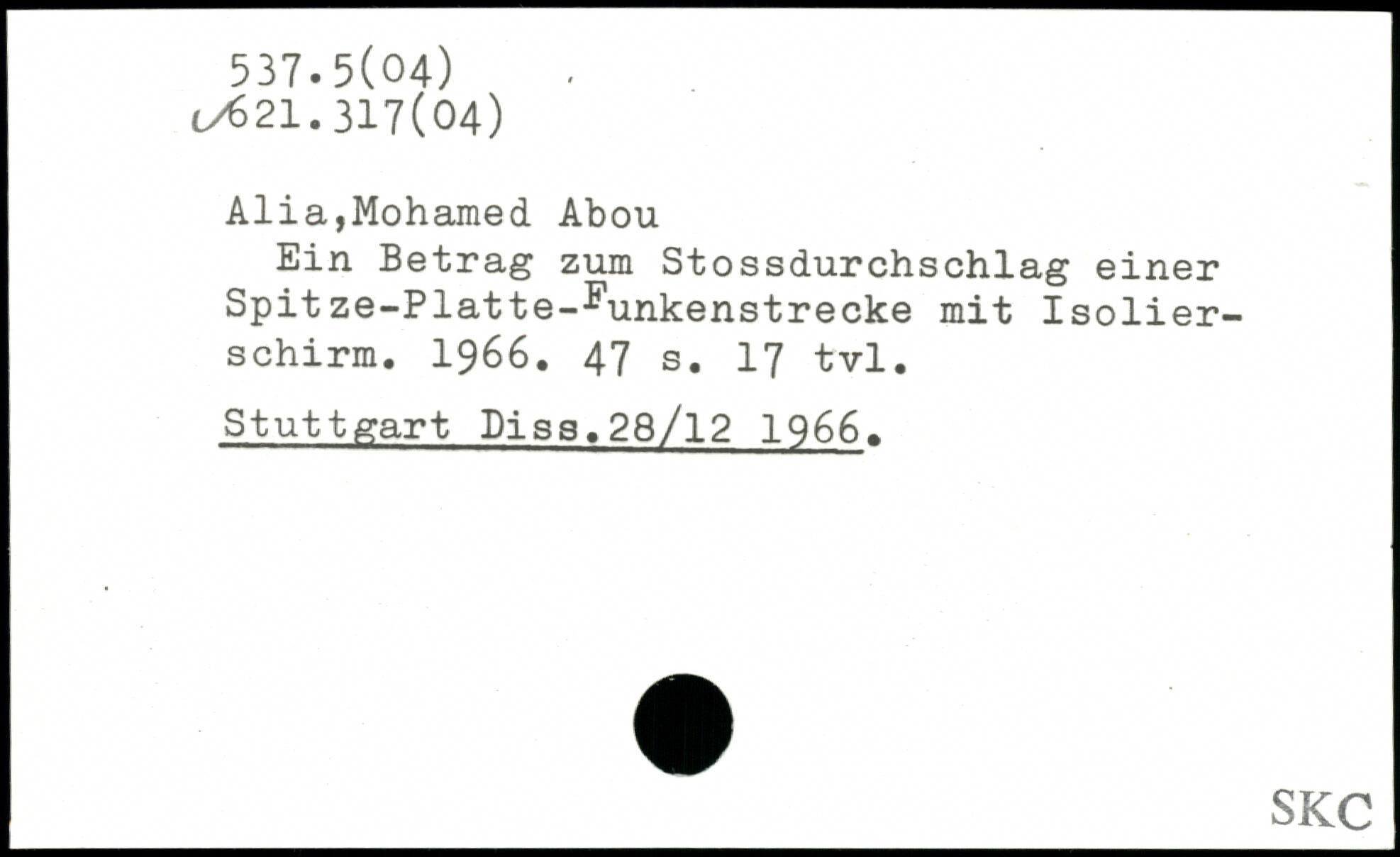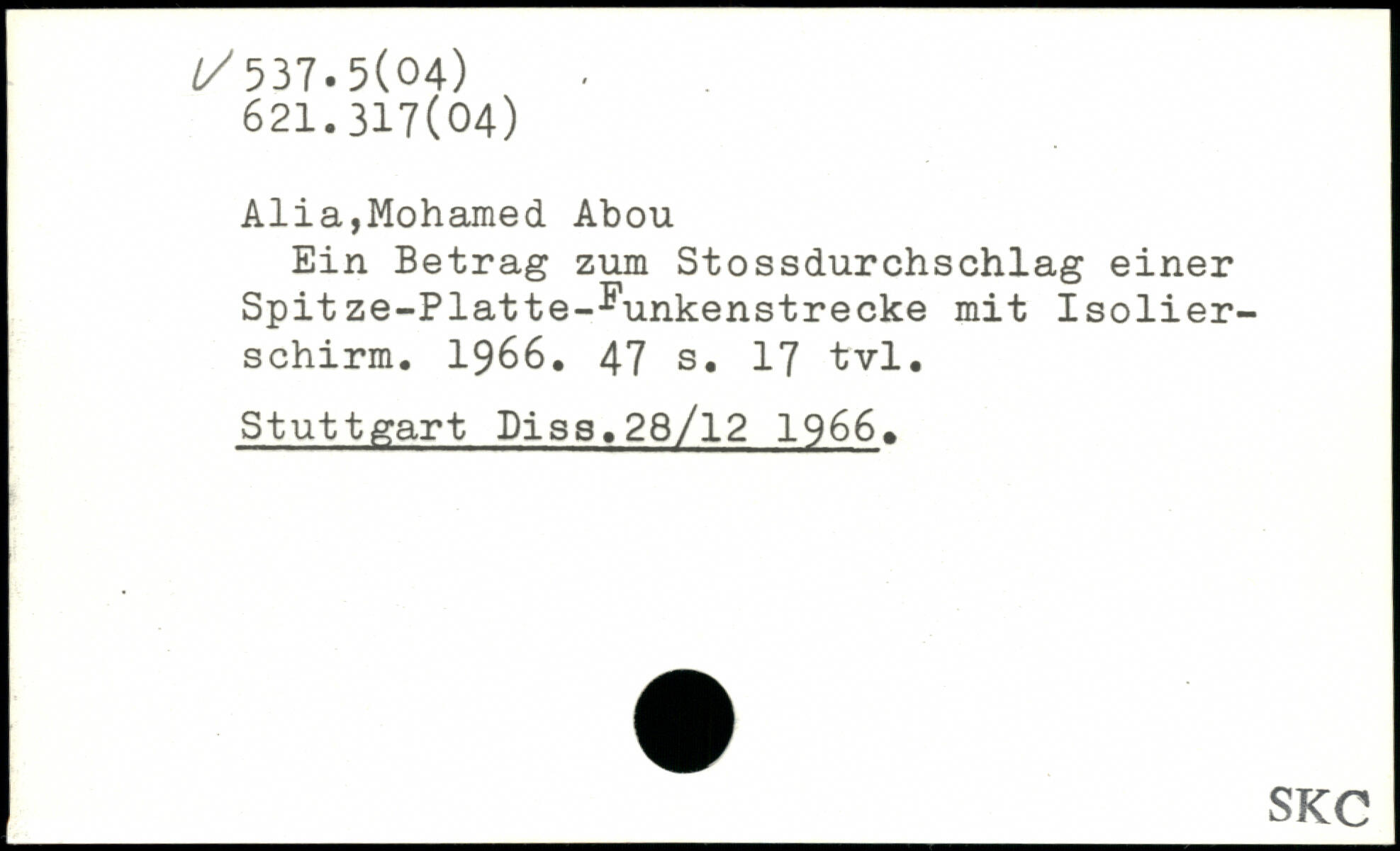 Alia,Mohamed Abou Ein Betrag zum Stossdurchschlag einer Spitze-Platte-^unkenstrecke mit Isolierschirm. 1966.