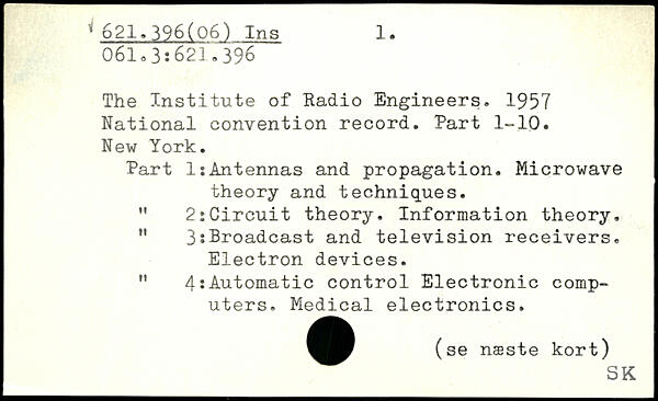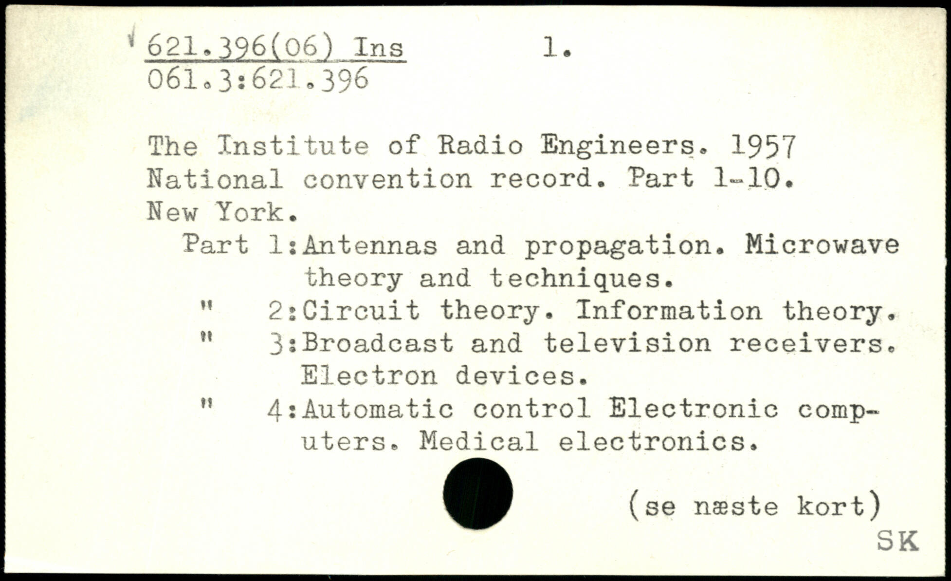 The Institute of Radio Engineers. 1957 National convention record. Part 1-10. New York. Part 1:Antennas and propagation. Microwave theory and techniques. " 2,Circuit theory. Information theory. " 3:Broadcast and television receivers. Electron devices. " 4:Automatic control Electronic comp uters. Medical electronics.