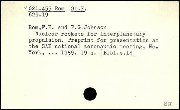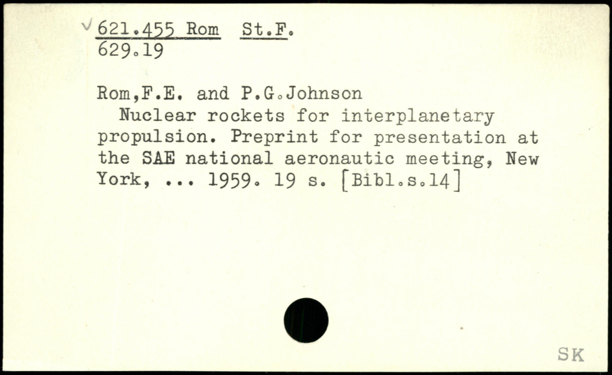 Nuclear rockets for interplanetary propulsion. Preprint for presentation at the SAE national aeronautic meeting, New York, ... 1959.