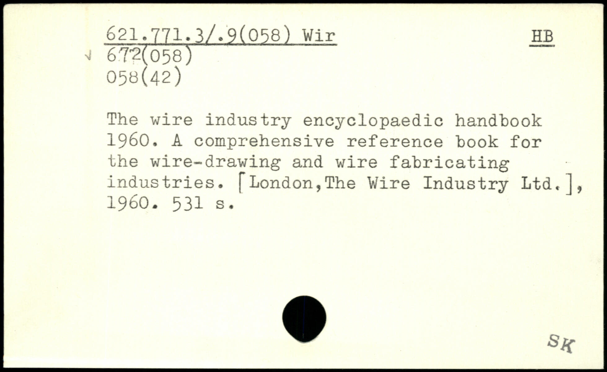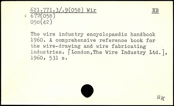 The wire industry encyclopaedic handbook 1960. A comprehensive reference hook for the wire-drawing and wire fabricating industries. [London,The Wire Industry Ltd,], 1960.