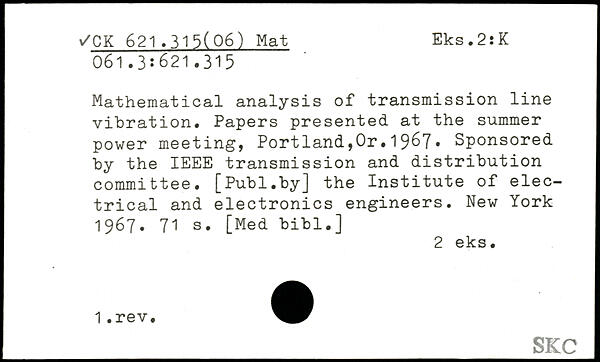 Mathematical analysis of transmission line vibration. Papers presented at the summer power meeting, Portland,Or.1967. Sponsored by the IEEE transmission and distribution committee.