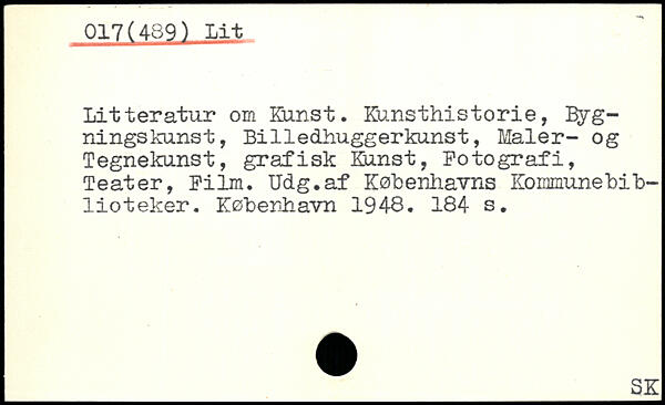 Litteratur om Kunst. Kunsthistorie, Bygningskunst, Billedhuggerkunst, Maler- og Tegnekunst, grafisk Kunst, Fotografi, Teater, Film. Udg.af Københavns Kommunebiblioteker.